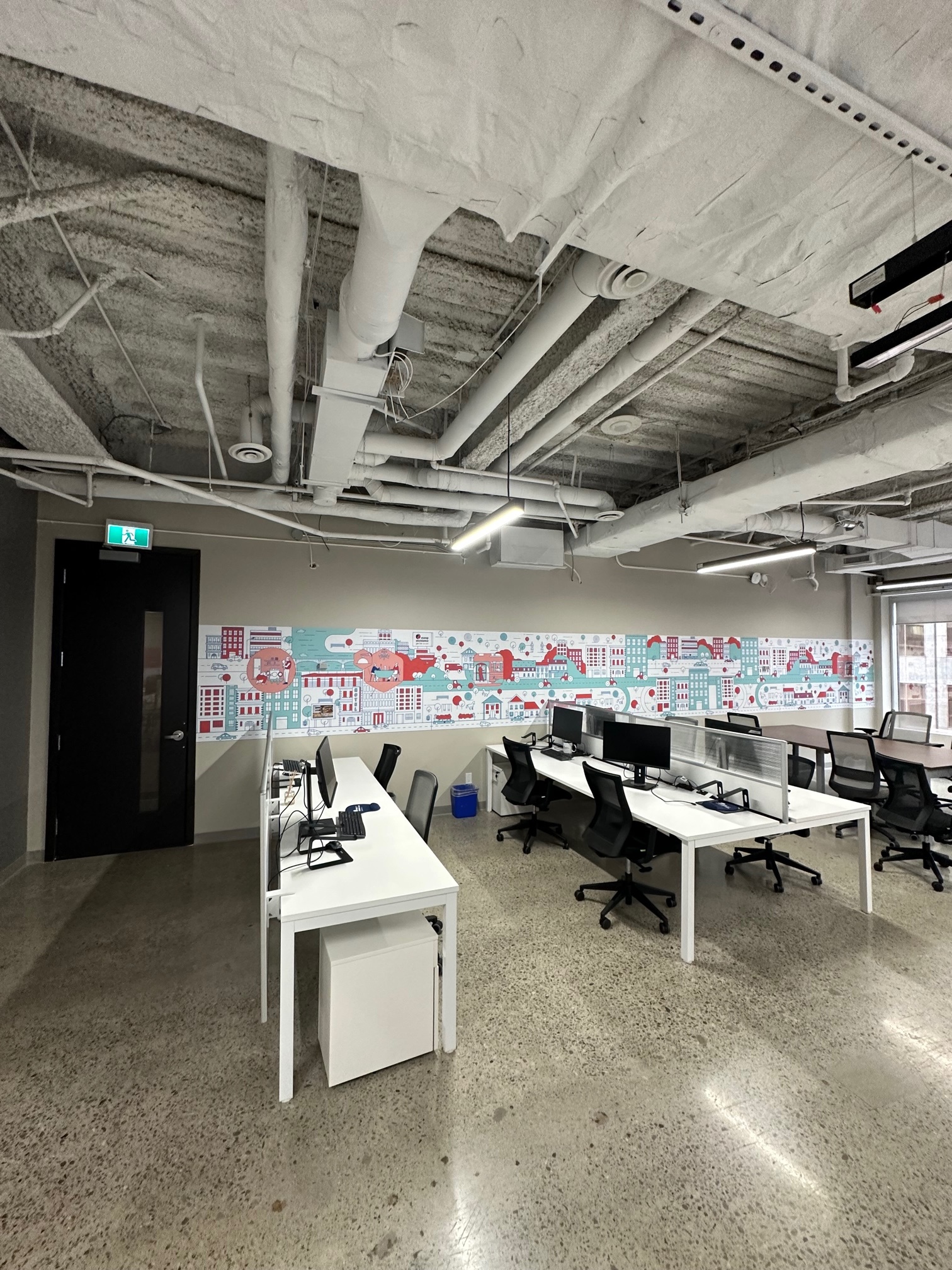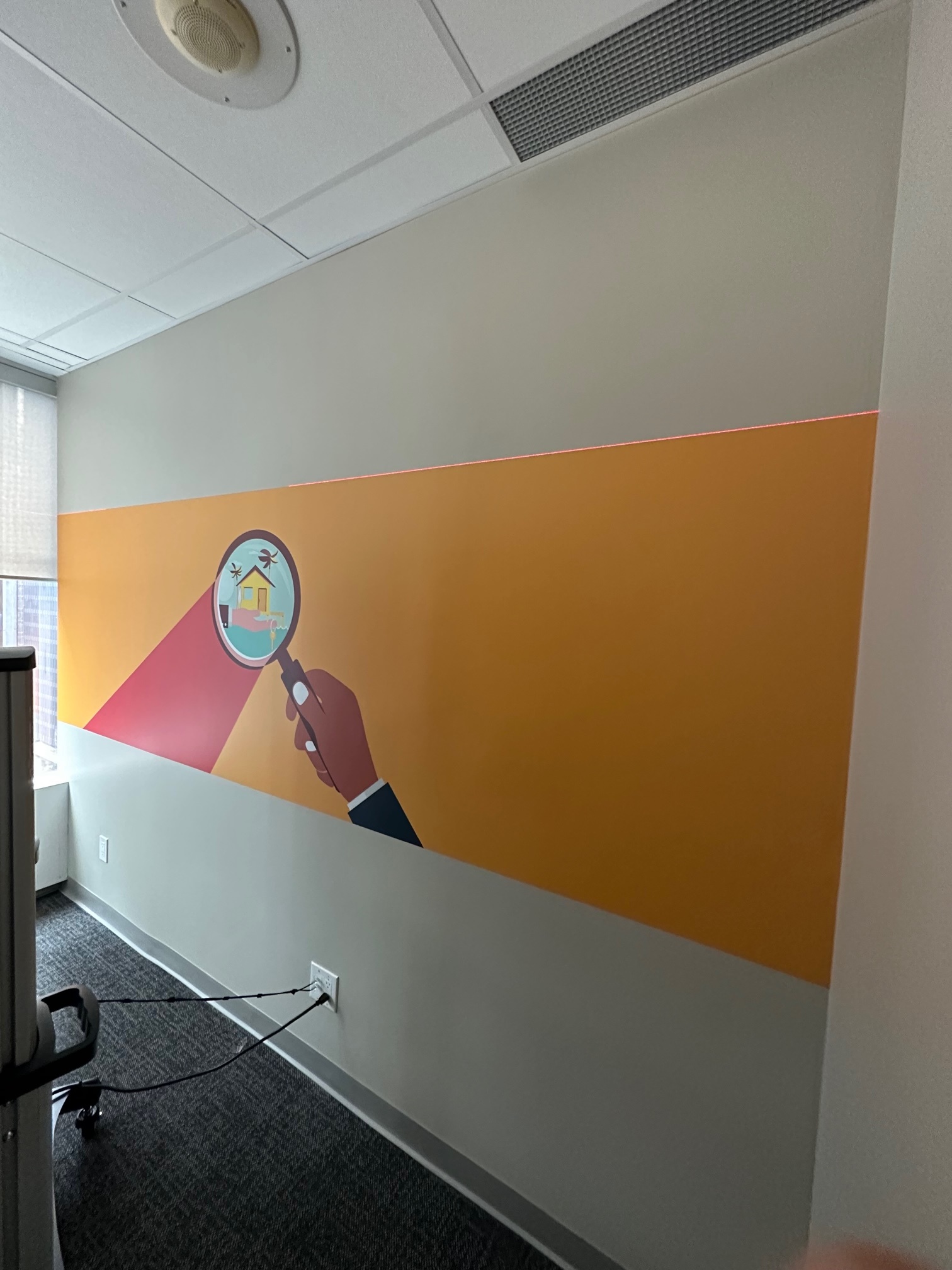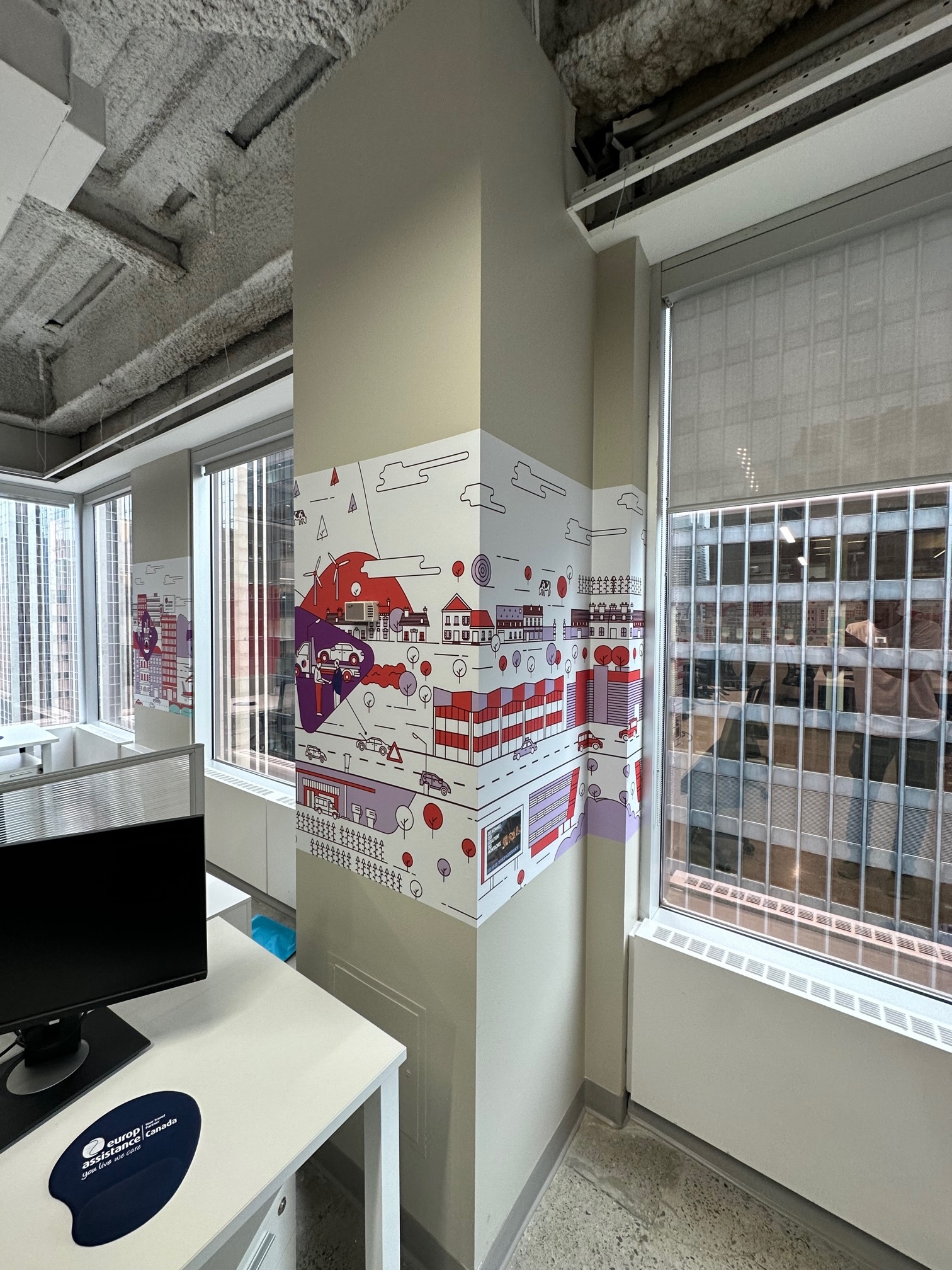 The custom illustrations, although provided, were extended and adapted to fit the specification of the new office space. The designs are vinyls and were printed and installed.