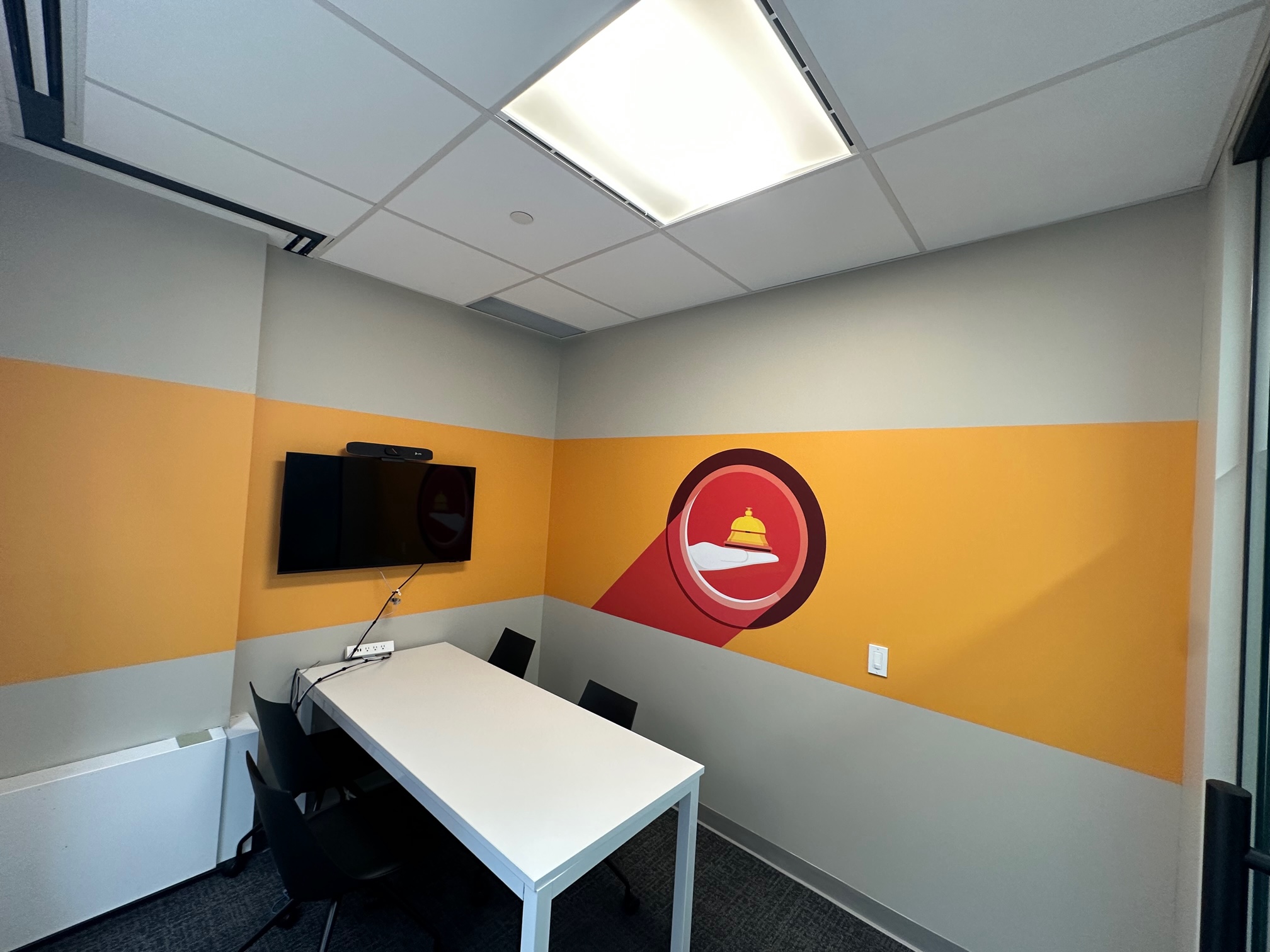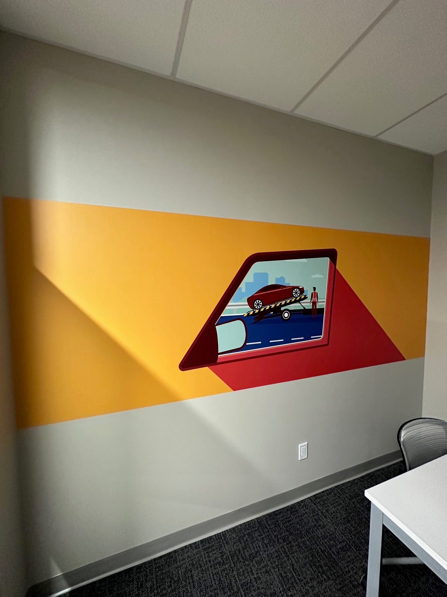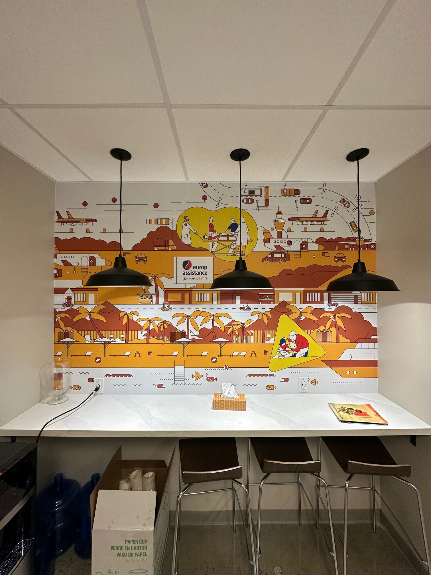 The designs are an extension of Europ Assistance brand identity assets. Particularly their custom contextual illustrations that capture the purpose of their business with simplistic illustrations and their brand colors. From the waiting area, to the open concept office space, to the meeting rooms and kitchen where tea will most definitely be spilled, every wall and space reinforces the uniqueness of the Europ Assistance brand.